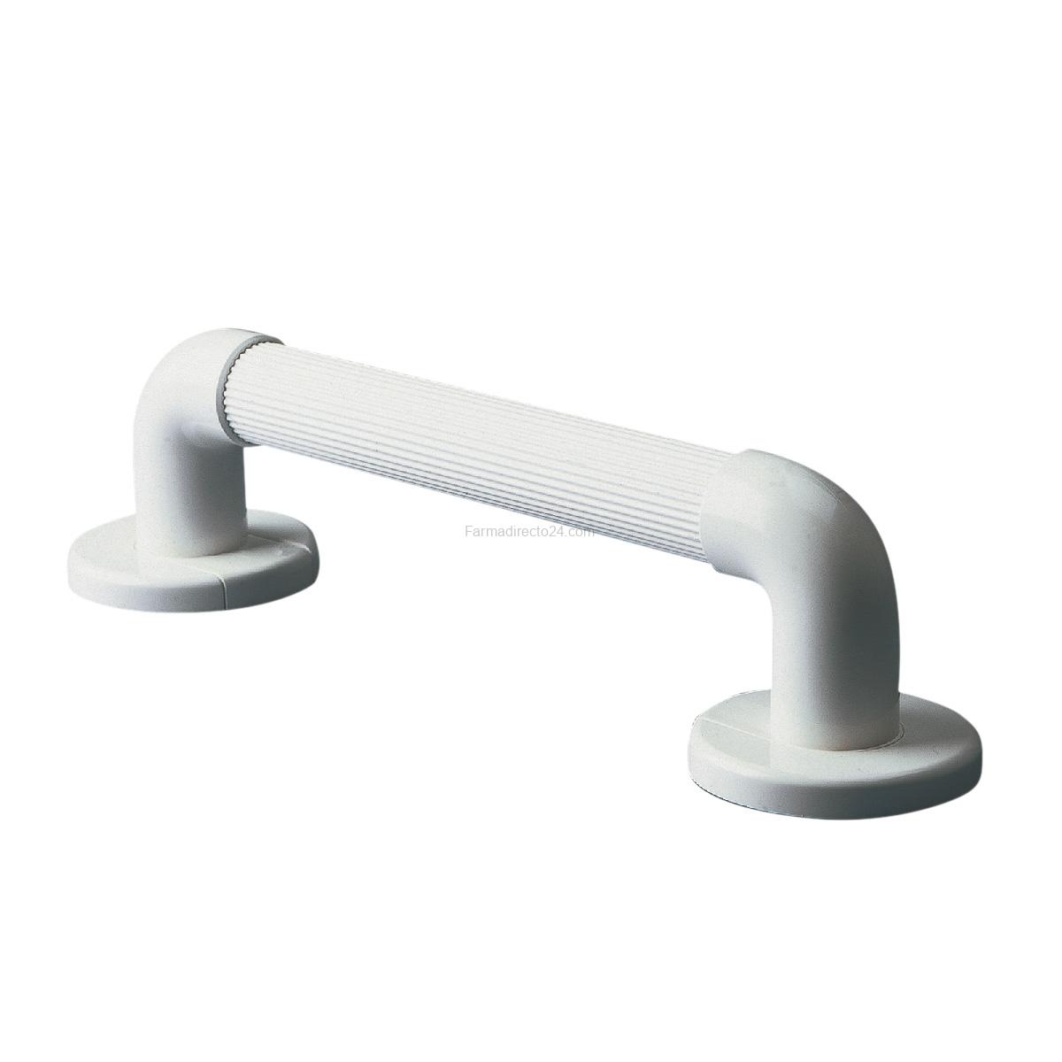 Asidera estriada construida en plástico PVC, con un diseño que impide la rotación sobre si misma. Los discos de fijación a la pared tienen unos embellecedores que se integran tapando la cabeza de los tornillos. El ranurado proporciona un agarre seguro, incluso con las manos mojadas.