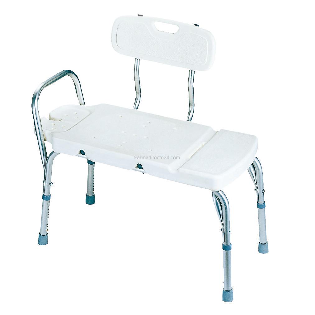 Silla de aluminio, regulable en altura de 46 a 57 cm. Se colocan dos patas dentro y dos fuera, así tendremos una silla dentro de la bañera y otra fuera. La transferencia al entrar y salir de la bañera es así más cómoda y segura. El banco de plástico tiene orificios de drenaje. La asidera reposabrazo, colocada en la parte interior del banco ofrece una ayuda adicional. Su diseño permite tener una silla dentro y otra fuera de la bañera.
