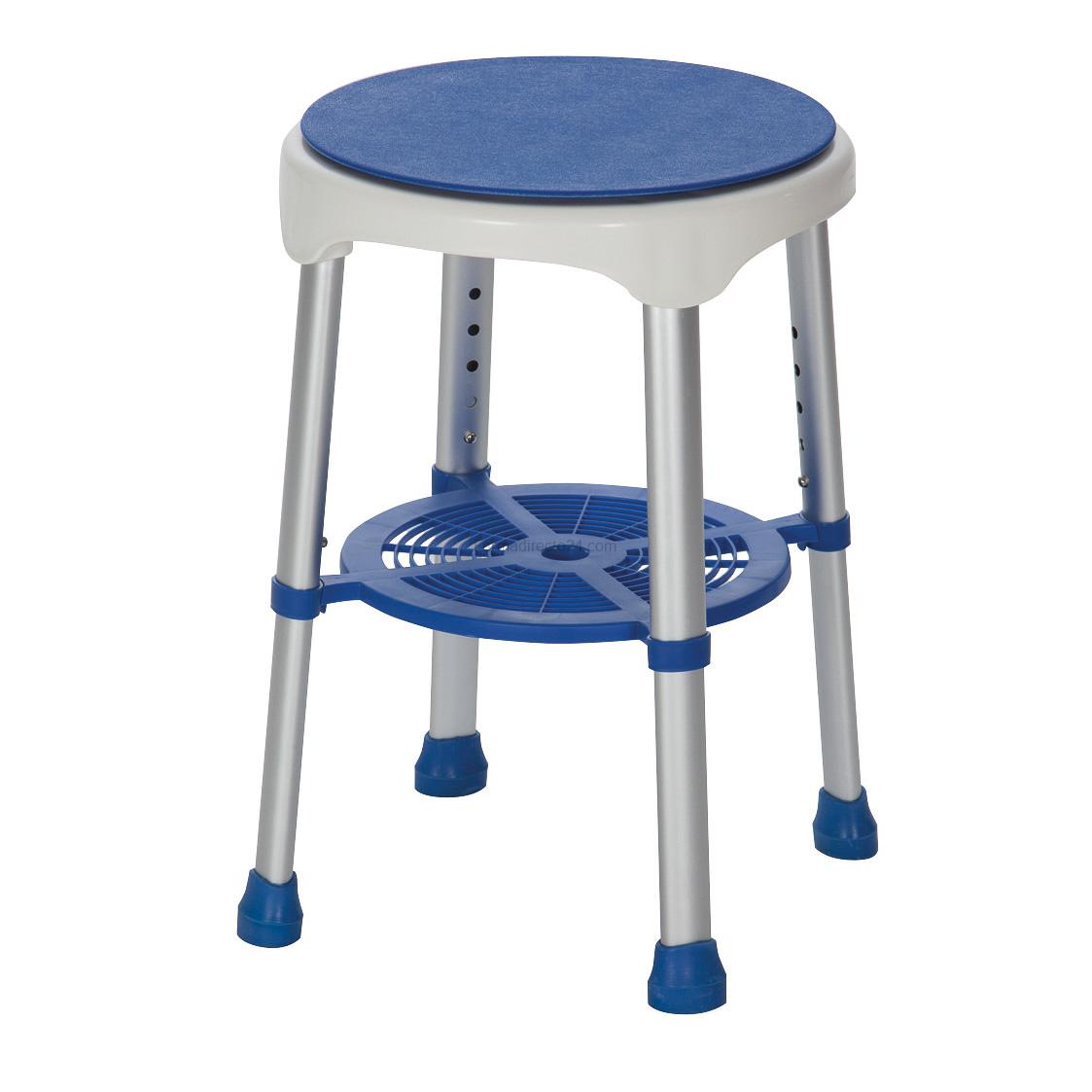 Taburete inoxidable con asiento giratorio para facilitar la movilidad. Patas de aluminio de altura regulable. Incorpora una práctica repisa para poder dejar esponjas, jabones, incluso el teléfono de la ducha. Desmontable sin necesidad de herramientas.