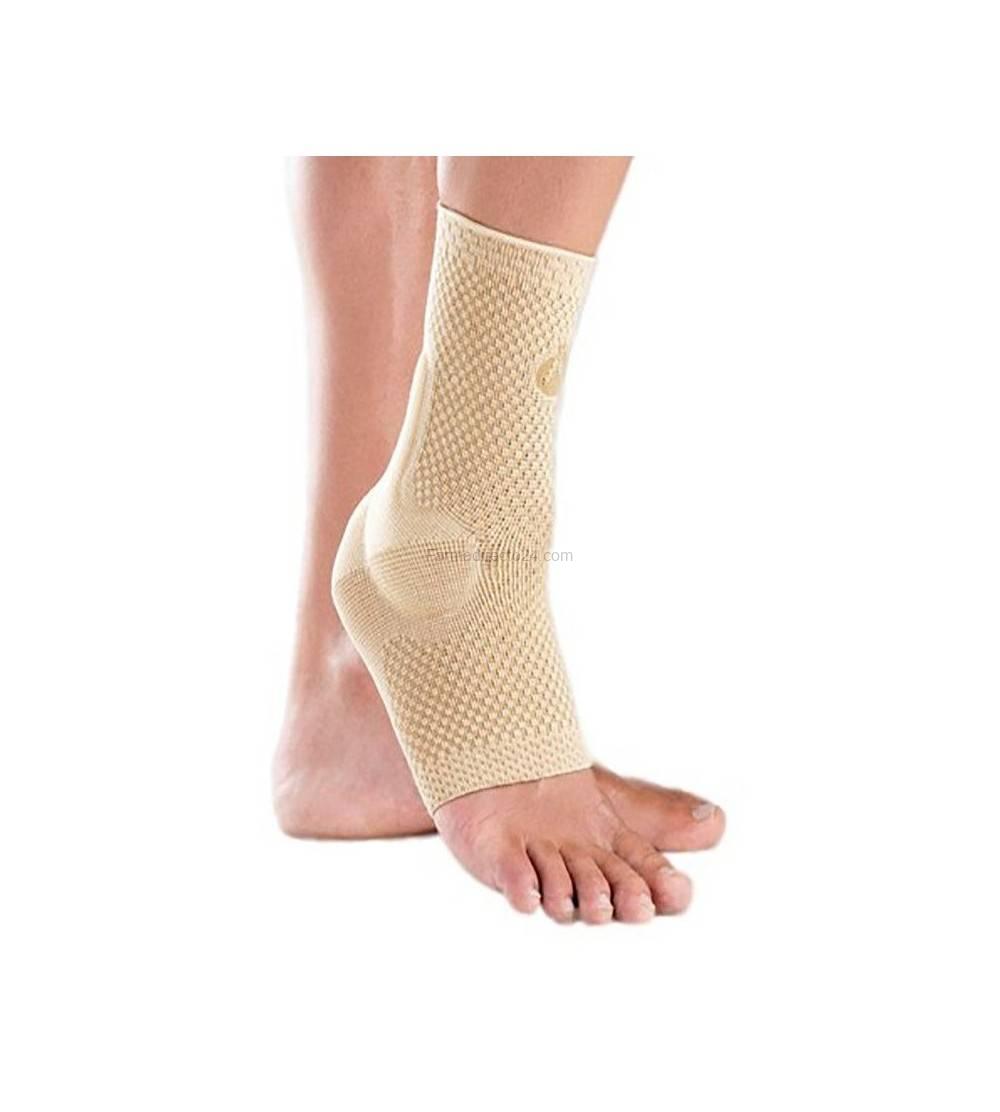 Orliman tobillera elástica con almohadillas. Ortesis de tobillo confeccionada en tejido elástico de punto transpirable por medio del tricotaje plano, incorpora dos almohadillas visco-elásticas con forma anatómica que redistribuyen la compresión del vendaje desde los maléolos prominentes hacia las partes blandas de alrededor. Color beige.